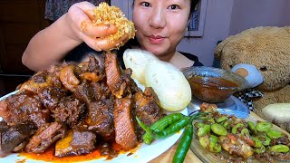 Spicy Red Beef/ Buff Meat And Innards Mixed Curry, Stink Bean Chutney, Boil Cabbage And Rice Mukbang